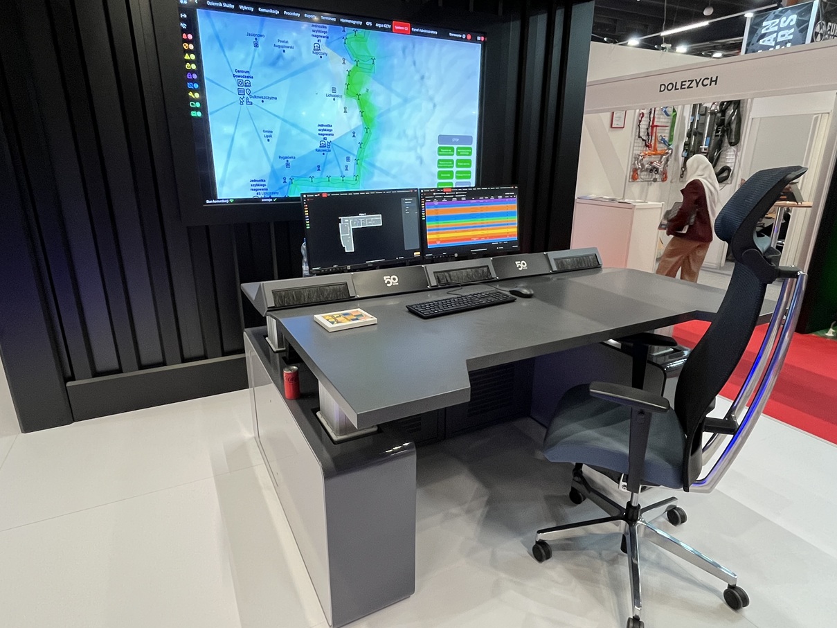 Firma ZPAS zaprezentowała stanowisko dyspozytorskie z regulowaną wysokością blatu, umożliwiające pracę operatora także w pozycji stojącej.
